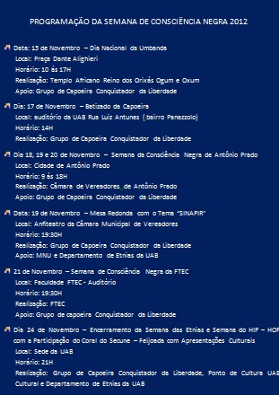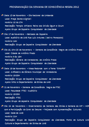 Dia 29/10/12 aconteceu o Grande evento de formatura de capoeira (Batizado) o Grupo de capoeira Conquistador da liberdade com a formatura de Mestre Tocha que recebeu de Mestre brasil o cordel Branca e azul de terceira Mestria também Tivemos a Formatura de mais um Mestre em Caxias do sul Mestre macaco que recebeu a cordol de Branco e verde primeira mestria.